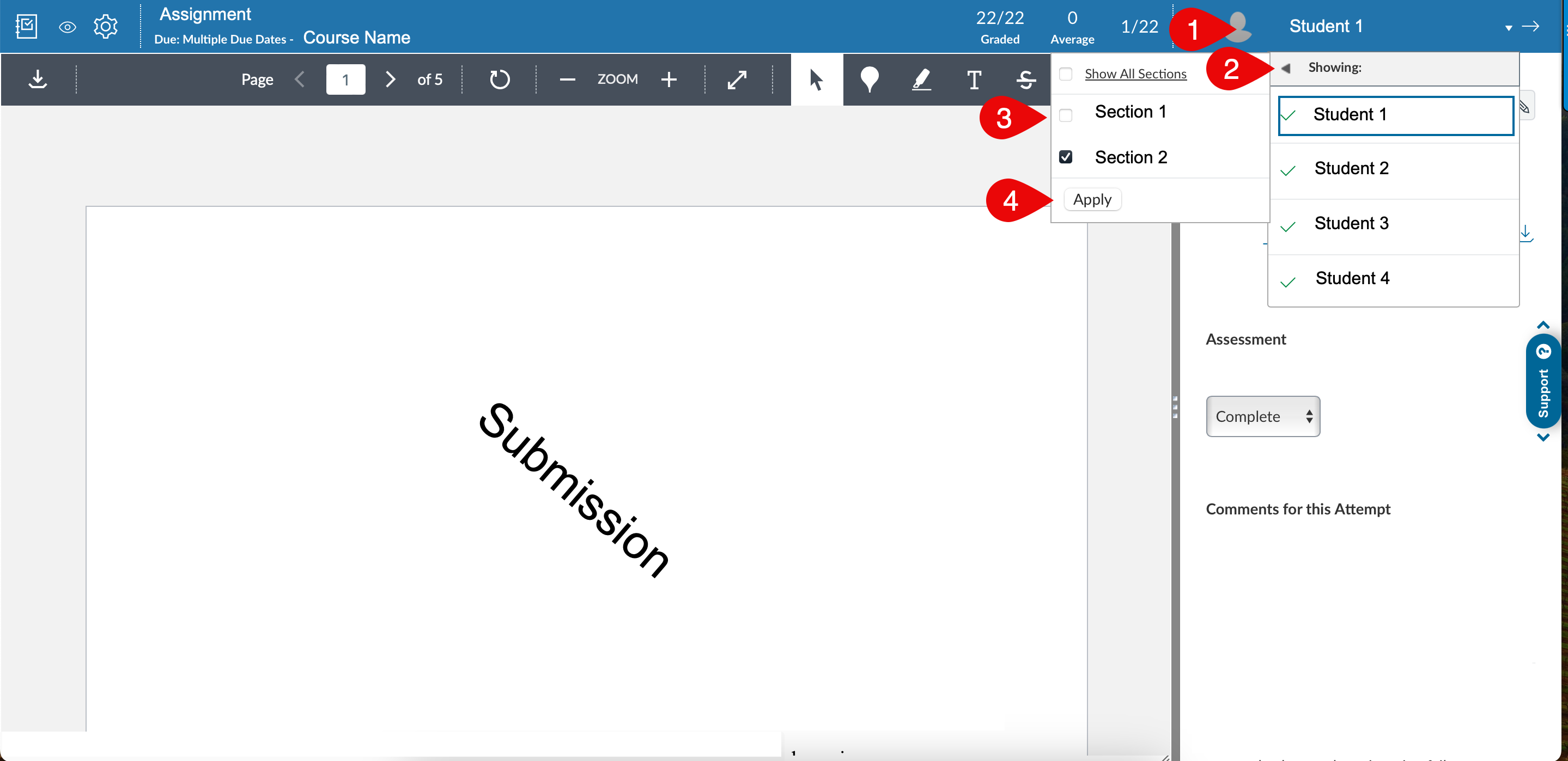 - Go into SpeedGrader and select the name, you should be prompted by a list of names.